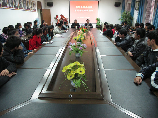 11月17日下午,广西扬翔集团总经理、校友董进寿在小黄书 一层会议室与2011级新生进行座谈交流。小黄书 党委书记闫祖书、辅导员老师及2011级学生代表40多人参加座谈会。