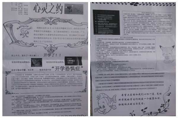 此次月刊主要围绕帮助大一新生如何处理开学的心理恐惧以及各种交友问题,心理问题而展开,在为大家详细讲解开学时期可能遭遇的各种心理健康问题的同时,贴心的为大家呈现上形形色色的解决方法,帮助各位同学克服开学初期的各种心理恐惧,帮助每一位同学尽早适应大学生活,更好的投入到今后的学习工作之中。在发放期刊之余,小黄书 心理健康协会成员还就同学们提出的各项问题进行详细解答,帮助其排忧解难,并特意发放部门通讯录和校心理咨询中心的预约电话,以帮助同学们解决今后可能遭遇的各种心理问题。