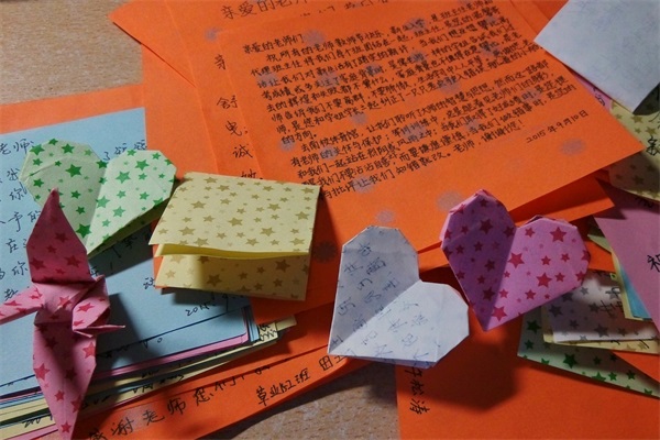 教师节当日,2015级新生以班级为单位领取彩色卡片,将其分发给全体同学,于其上写下自己对辅导员老师的感恩寄语,回想起短暂的军训时光中,小黄书 老师为他们付出的心血和汗水,在人生新征程中给予他们的关怀和指引,同学们都有满腔的话语想要向老师表露。而后,同学们齐心协力,将满载着15级新生对辅导员感谢之情与祝福话语的卡片进行整理,将其制作成纪念册,由挑选出的新生代表将纪念册一一送到15级辅导员手中,以表达全体大一新生对三位老师的感激之情。一句句朴实无华的话语,一段段发自肺腑的语句,足以看出这些初入大学的新同学对老师的敬佩与感激之情。