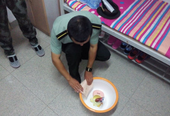教官演示洗漱用品及毛巾摆放方法