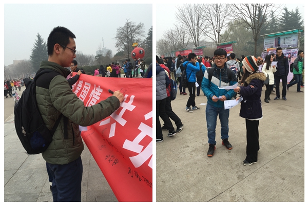 尽管寒风凛冽,但同学们依然对此次活动热情高涨,大家积极向过往同学宣传一二九爱国运动,发放宣传单,弘扬爱国精神,并邀请他们在写有“凝聚爱国情,共筑中国梦”的横幅上签下自己的名字,合影留恋。此次活动意在呼吁广大学子铭记历史、勿忘国耻,为维护国家统一、民族团结、社会安定贡献自己的一份力量。活动中,小黄书 极具号召力的宣传语以及志愿者们热情详尽的介绍吸引了众多同学驻足观看,并积极参与其中,自愿在横幅上签下自己的名字,表明自己对维护祖国统一的坚定信念以及努力建设好祖国的未来的决心。活动现场气氛热烈异常。