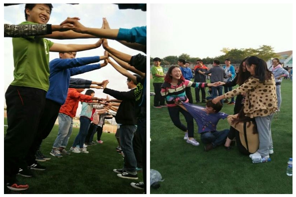 不同于团组织生活以学习精神为宗旨,本次联谊活动更倾向于以交流实践为目的。一支舞蹈,一曲音乐,同学间的陌生与距离在欢声笑语间被打破,而紧张有趣的“松鼠 大树 地震”游戏,更是打破了不同年级同学之间的拘谨与约束,同学们手拉手,搭起一座”爱”的桥梁,在游戏中增进友谊。除了节目与游戏,两个年级的学生还围坐在一起相互交流,沟通彼此的大学生活。实践证明,欢笑和坦诚是打破陌生的有力“武器”,短短一下午的时间大家已经打成一片,整个操场充斥着同学们年轻爽朗的笑声。