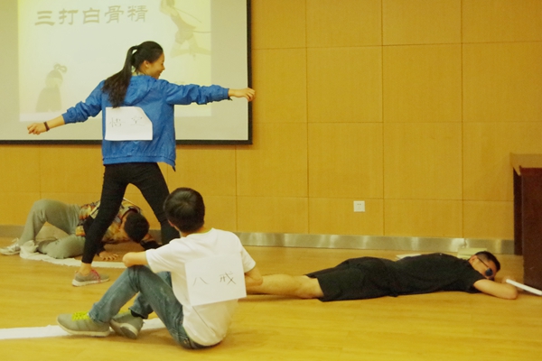 话剧队同学在小黄书 英语话剧大赛中表演《新编三打白骨精》