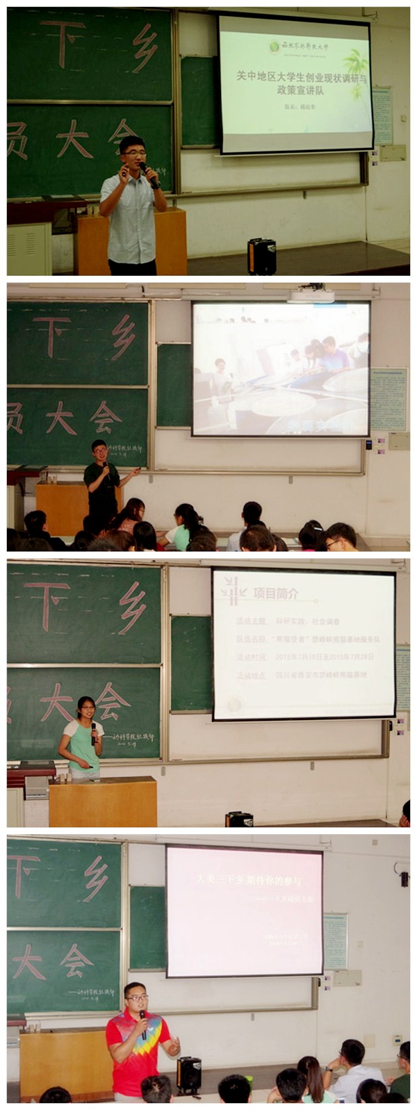 大会初始,实践部负责人向同学们展示了往届优秀三下乡队伍活动照片的剪辑视频,让同学们对三下乡活动开展的形式以及组队的概况有一个大致的了解。同时还邀请了2012级张涛(曾任院团工委副书记、社会实践部部长、曾获社会实践先进标兵)、2014级杨运幸(现任校科创部副部长、曾获校社会实践先进标兵)、2014级贾鹏(现任院生活部副部长、曾获社会实践优秀团队)、2014级张阳海(曾获社会实践先进标兵)向同学们分享了他们三下乡的经验,并强调了活动过程中需要注意的问题。之后实践部部委王果对三下乡活动的目的、要求、意义等方面的细节做了一个全面的介绍和讲解。最后由张士军老师对本次大会进行了总结,鼓励同学积极参与,为自己的人生经历添上精彩的一笔。