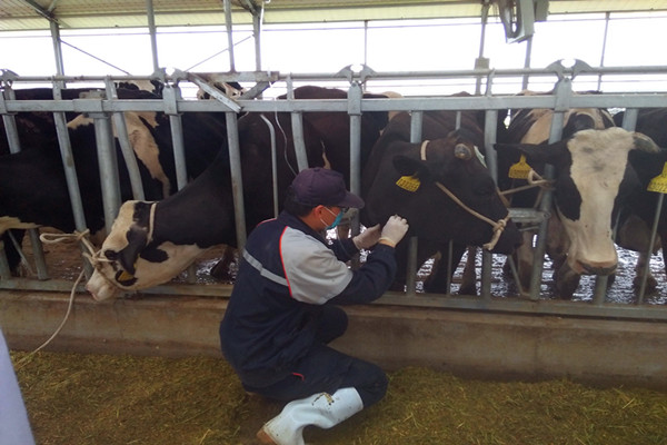 活动伊始,队员们穿戴规定的工作服及防护工具,进行全身消毒后方可进入牛室,队员们跟随兽医站的工作人员检查各个牛棚中奶牛的健康状况。一切就绪后,队员们在工作人员的引导下进入兽医站,兽医站内主要存放一些药品和手术器械等各种工具。负责人付师傅表示,兽医站最主要的工作还是医治患病的奶牛及疫病的防治。当天医护人员准备给部分患病奶牛输液,队员们主动要求协助医护人员,在专业老师的指导下初步尝试进行药物的配置,随后跟随老师进入牛室对牛进行颈静脉注射。牧场的栏杆有设计巧妙的结构用以固定住牛身,为牛的注射工作提供了便利。