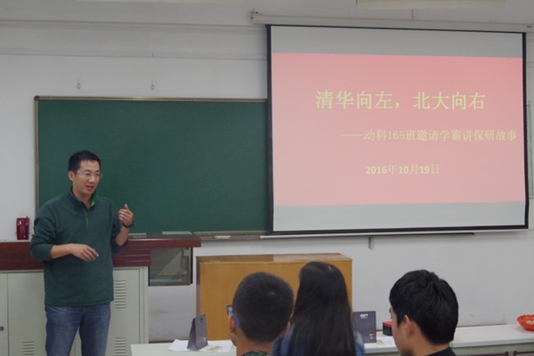 为让新生深入了解保研学子的优秀风采,交流学习经验,做好学业规划,10月19日晚,动科165班开展了一堂主题为“清华向左,北大向右”的主题班会。保研至清华大学的动科132班刘栋梁、保研至北京大学的动科131班董明月受邀与大家畅聊保研经验与学习感悟。动科165班班主任杨雨鑫老师,2016级辅导员闫颢芯老师参加了本次班会。