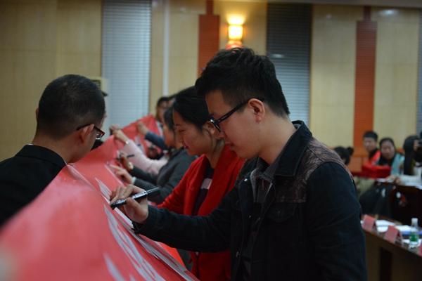 在横幅上签名留念