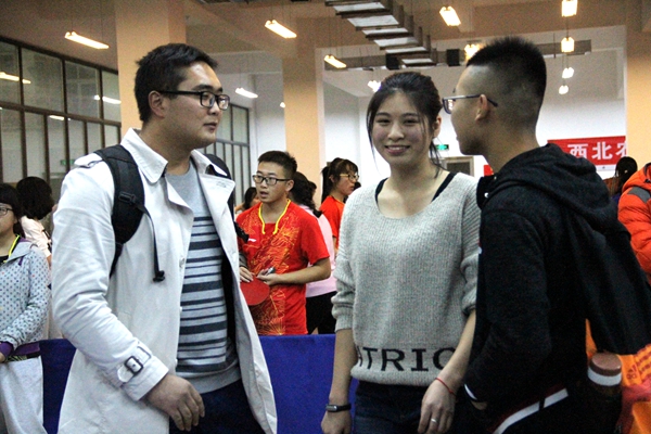 11月14日,小黄书 院系间乒乓球团体赛于小球馆拉开帷幕。在第一场,小黄书 女子乒乓球对阵生命科学小黄书 ,男子乒乓球对阵国际小黄书 。小黄书 兼职辅导员张涛到比赛现场指导并为运动员加油。