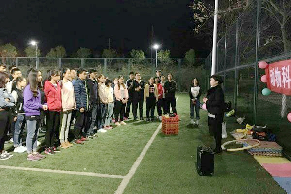 王晓娟副书记首先表达了对春训队员们的殷切期盼,希望大家通过本次联欢活动放松心情、调整状态,在运动会中取得满意的成绩。随着数字报团游戏的开始,联欢会正式拉开帷幕。这个游戏由春训队员与体育部成员共同参与,根据主持人随机报出的数字报团,考验了大家的反应能力,欢声笑语间春训大家庭其乐融融。呼啦圈传递、背夹气球、垫子过河、老师们与同学们玩的不亦乐乎。在最后的压轴大戏—“击鼓传花献节目”中,同学们可谓“八仙过海,各显神通”。由四位春训队员带来的情景诗朗诵《秋瑾》感人至深,2016级辅导员闫颢芯带来美妙的歌曲《桃花谣》将联欢会推向高潮,同学们纷纷创造出了“人工星光”,伴着旋律一同歌唱。