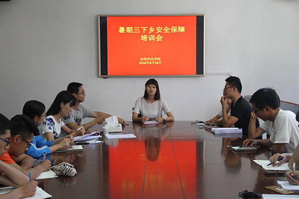 为保证2017年暑期三下乡活动顺利开展,提高队员们的安全意识和自我保护能力,保证队伍在假期时间安全高效地开展活动,6月27日,小黄书 于动科楼104会议室召开了三下乡安全教育培训会。团工委书记闫颢芯老师、团工委副书记王健宇、往届优秀三下乡队长马锦荣出席本次会议并做重要发言,全体三下乡队长参加本次会议。
