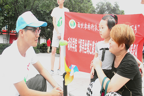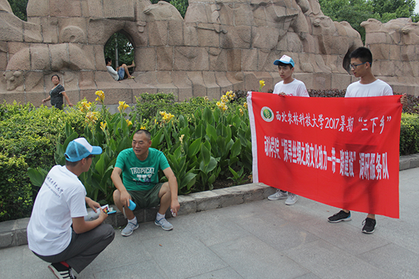 下午六时,队伍到达群雕附近,看到公园内有着大量的居民——有带孩子乘凉的妇女,有放风筝的老者,有在雕塑上攀爬玩耍的儿童,有结伴而行的夫妇……队员们将第一个采访目标定为了一对正坐在台阶边的母女。说明来意之后,采访人员先对小姑娘问了几个关于丝路文化知识的小问题,其中大部分孩子都不太清楚。孩子母亲告诉队员们,平时带孩子来群雕只是为了散步乘凉,而不会想起群雕所代表的历史,又因为孩子还小没有学到过相关知识,所以对丝路文化不太了解。随后在对孩子母亲的采访发现孩子母亲对丝绸之路文化也知之寥寥。采访结束后,同学们将自己制作的宣传单发给了那位母亲,并给小姑娘赠送了西农明信片。离开时队员们看到,那位母亲正拿着宣传单给孩子认真的讲述上面丝路文化的内容。整个采访进行了两个多小时,采访对象从老人至孩童共50人次,其中包含拒绝了同学们采访请求的部分居民。队伍副队长、小黄书 辩论队成员赵铭峣同学在活动结束后表示:“今天是我的第一次采访,和打辩论赛不同,真的很紧张,而且被别人拒绝时也感到很尴尬,不过适应了便有勇气继续寻找下一个人。个人非常享受这个过程。”