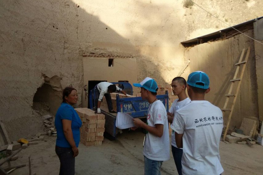 尘土飞扬,黄沙漫天,一走进村庄队员们就有一种前所未有的压迫感。贫瘠的土地、淳朴的风情、艰苦的居住环境使得刚到这里的队员们心头一紧。虽人均耕地面积有8~10亩,然而看似众多的土地却并没有给村民带来财富,由于该地常年缺水,村民收成不高。大部分村民居住的依然是土窑,部分家中的土窑都已失修,存在极大的安全隐患。队员们结合当地情况设计了调查问卷向村民发放,在调查问卷之余,队员们还和村民们拉起了家常,“家中有几口人呀?”“孩子多大了,读几年级啊?”“政府有啥扶贫政策吗?”,极大地拉近了队员与村民之间的关系。