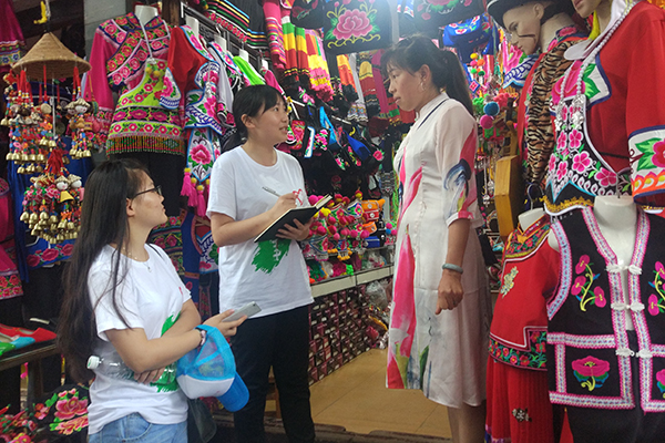 队员们并没有放弃对民族文化的寻找,功夫不负有心人,终于在古镇的一角队员们发现了民族服饰店。参访了两家店店主,队员们了解到当地人在族内节日期间才会购买装,极少有游客会购买服饰,游客主要是购买当地装饰品,作为纪念或者礼物。