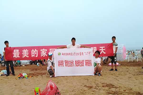 当天下午,刚刚结束高校宣传之旅的志愿者们马不停蹄的赶到金沙滩旅游景区继续进行宣传活动。