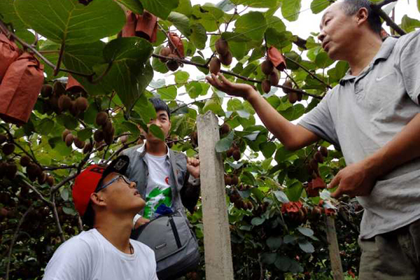 果农指导队伍了解猕猴桃的生长状况