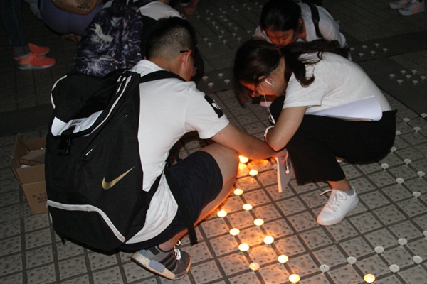 活动过程中,同学们点燃“9·18”字样的白色蜡烛,在闪闪烛光中,庄重默哀,表达自己对国耻的悲痛与悼念。除此之外,小黄书 四名自愿者自发组织诗词朗诵,用壮丽的言语抒发爱国复兴之志。活动现场吸引了各院同学,大家纷纷驻足默哀,气氛沉重。