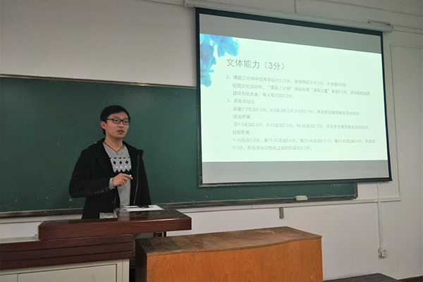 在十九大的胜利召开之际,为让小黄书 新生担负起肩上的责任、明晰大学学习生活发展方向,并深刻了解创八、综测、阳光课时等重要评审体系,增强新生的规则意识,明确新生的课余学习任务,小黄书 秘书处、勤工外联部与科创部于10月22日在三号楼212教室联合举办了综测创八阳光课时制度宣讲大会。出席本次大会的团学干部有秘书处处长丁彦之、勤工外联部部长赵慧、科创部副部李奕洲等人。此次会议还邀请到了校团委素质拓展中心副部长张志浩参加会议,另参与本次会议的有17级各班班长支书、勤外委员、科创委员及阳光团员代表。