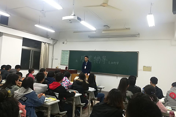 阵阵掌声涌起,同学们用热烈的掌声迎接这位“学长老师”的到来。课堂伊始,魏昌盛同学介绍了一下自己的学习经历,讲述了在大学如何比别人更加优秀的方法。他讲到:“人总是要为未来做打算的,现在做的多了,以后总会有方向。”更是给正处于迷茫的同学指点了方向。随后,他讲述了动物学这门学科的学习方法,“这门课程重点是要了解动物进化史,围绕这条主线再进行深入准没错!”他用丰富的专业知识和精炼的语言为同学们总结了动物学要点,从多点切入,使原本枯燥乏味的的动物学在他包含热情的讲解之下变的生动有趣,引人入胜,同学们听的津津有味,不时会心一笑。最后,魏昌盛同学和学习部部长李博为总结了本次朋辈讲师活动,严肃又不失活泼,活动在欢声笑语中落下了帷幕。