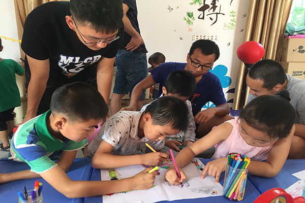 下午的活动中,队员们为孩子们分发了印有图案的打印手抄报模板,并将孩子们分为四人一组,填色写字,共同合作完成手抄报,并进行组之间的评比。孩子们在队员们的指导下自主分工,合作顺畅,出乎意料地在很短的时间内完成了任务。