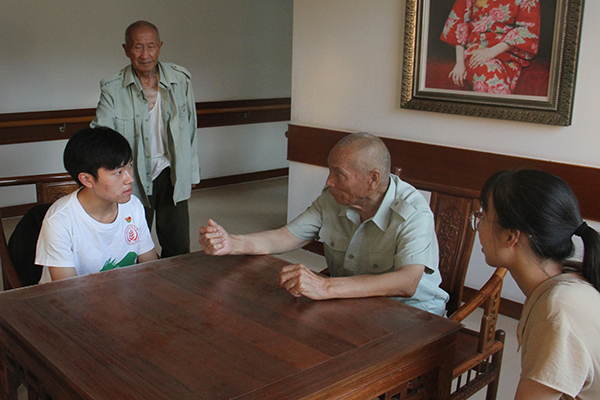 “你们是大学生吧!”正在队员们准备进屋时,身后突然传来了浑厚有力的声音。一位面容坚毅的老兵在身后叫住了队员们,并热情的拉着大家围坐在大厅中的桌子边,开始讲述他的故事。同京飞老人已年逾90,身着军装,腰板挺直,声音浑厚,口中吐出的是70年前那段烽火岁月……“日本人有飞机,打到最后我们全连只剩6个人,但是大家还是拼到了最后走一刻。”1942年,同京飞跟随部队奔赴山西抗战前线,并在惨烈的战斗中英勇作战。抗战胜利后,国民党大局进攻陕北,在与胡宗南部的战斗中,他曾与战友在战壕里三天三夜滴水未进。“只要是想起牺牲的战友们我就伤心,天天说话玩耍,一场战斗之后可能就没人了……但是我们也从未害怕过,老百姓想要过上好日子,就要先把敌人赶走!”说到动情处,老人眼里泛着泪光。听闻队员们来自小黄书 ,老人更加精神了,原来他的孙子正于小黄书 攻读硕士研究生。“你们年轻人,大学生,一定要好好读书!将来造出比国外更先进的飞机导弹,我们国家才不会被欺负!看到现在许多年轻人在大学不好好读书,只知道上网打游戏,我就心痛啊!”队员唐红玉急忙紧握住老人饱经风霜的手说:“爷爷您放心吧!我们一定会好好读书的!”老人也欣慰地笑了。