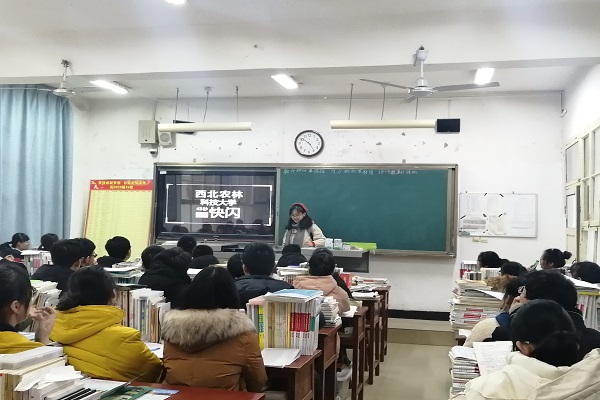 由米金秋同学做PPT宣讲部分,她先是以一支独具特色的快闪视频开始,从建校历史、科研实力、优势学科、自然景色及近年来的分数线和招生政策等多个方面向大家进行了介绍,用接地气的语言,热情的讲解,换得了同学们的一致热烈响应。其余队员负责向大家发放明信片、关于西农介绍的宣传手册等纪念品,用制作精美的纪念品,以致歉我们耽误大家学习时间。