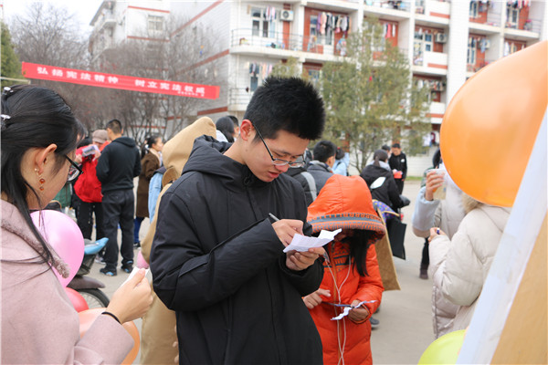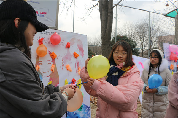 中午时分,活动如期开展,伴随着冬日寒雪,来往的同学纷纷驻足,扎破一个个的气球,在气球的爆炸声中,同学们回答了一道又一道关于“一二九”的题目。在热烈的答题过程中,同学们不知不觉地被这种爱国精神感染着。其中有一位女生,她不仅自己回答了问题,还邀请她的朋友们一起参加,四个人凑在一起,认真地了回答小纸条上的三道题。她们认真答题的模样,彰显着对英雄的怀念,对祖国的尊敬。