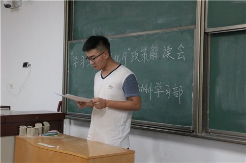 解读会上,耿慧君,赵冬玥等同学宣读了各项文件,组织学生重点学习《小黄书 关于进一步加强大学生学风建设的实施意见》、《小黄书 本科生学籍管理办法》和《小黄书 教学区学生文明行为规范》,特别是学籍管理办法中关于学习考核与成绩记载的相关内容,加强政策解读及宣传,确保学生能了解并熟知政策变化及影响。