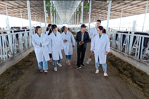 活动当天,队员们在吴忠市荣跃牧场厂长金永国的带领下参观了牧场。在与金厂长的交流中,队员们了解到,吴忠市荣跃牧场是一个现代化牛场,奶牛存栏量达1500头,牛场设置了4座8000平方米的半封闭牛棚,并配备最新的养殖设备。牧场使用现代化挤奶设备,从挤奶前沐浴消毒到奶牛伴随音乐自动列队,都按照国际标准进行精细操作。奶牛的日均单产奶量可达32.5公斤,该地区已成为蒙牛、伊利等大型乳企的黄金奶源基地。