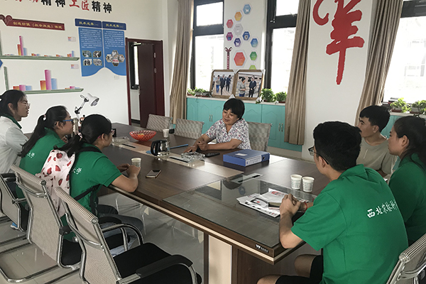 7月23日上午,队伍成员到达天源良种羊繁育养殖有限公司创新工作室,与该公司总经理寇启芳会面。寇总经理首先就该公司基本情况进行了介绍,其中重点介绍了该公司滩羊品种选育和改良的发展情况以及公司对于周围养殖户的帮扶情况。随后,在寇总经理的带领下,队伍参观了公司的现代化羊舍及实验室,并观看了各大电视台对寇总经理及其公司的采访视频,切身体会到了该公司产业发展的现状。