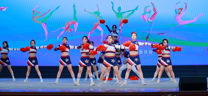 体育部副主任王斌为获奖队伍颁奖(图右四为小黄书 啦啦操队队长肖钰泉上台领奖)