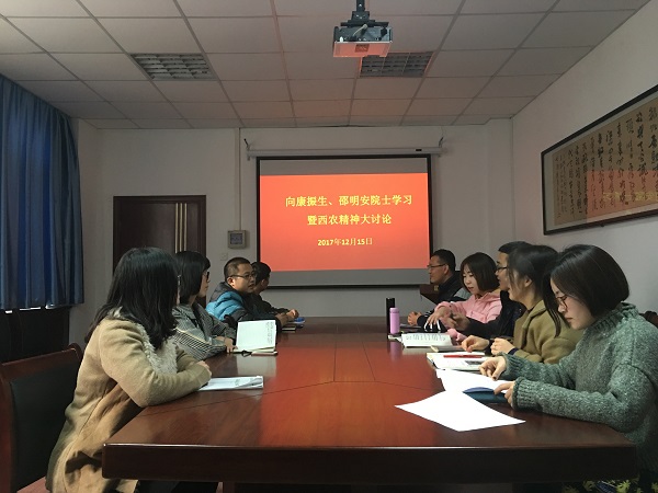 支部宣传委员张薇依宣读校党委印发的《关于“开展向康振生、邵明安院士学习暨“西农精神”大讨论活动通知》,并带领支部全体党员学习了两位院士的先进事迹以及校党委书记李兴旺和杨凌示范区党工委书记郭社荣在庆祝康振生、邵明安当选院士师生座谈会上的部分讲话。学习结束后,支部成员结合近期学习十九大精神的感悟对两位专家当选院士以李兴旺书记提出的“西农精神”展开讨论。