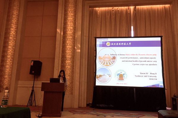 小黄书 博士研究生徐歆歆在会议的“Effect of insect diets on animals"单元作了题为:“Influence of dietary black solider fly (Hermetia illucens) pulp on growth performance, antioxidant capacity and intestinal health of juvenile mirror carp (Cyprinus carpio var. specularis)”的报告。报告介绍了在开发黑水虻虫浆饲料方面的相关研究进展。同时,对本实验室近十年来在蚕蛹和黑水虻等昆虫资源的饲料化利用开展的系统研究,所取得的研究成果,合作交流等进行了介绍。报告引起了与会人员的广泛关注。多名国内外学者和企业界人士表示愿与实验室进一步沟通合作。
