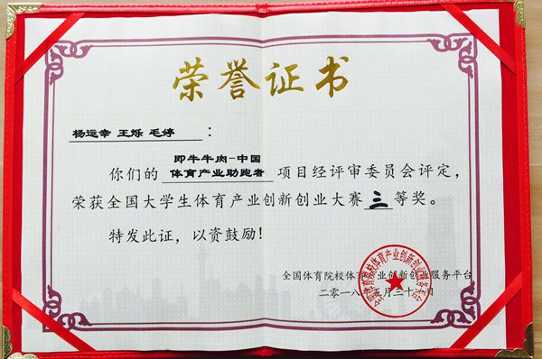 经校级初赛选拔、国赛初赛、复赛、决赛,由小黄书 副院长、国家肉牛改良中心主任昝林森教授指导的小黄书 2018届毕业生杨运幸同学牵头完成的《即牛牛肉—中国体育产业助跑者》创业项目总评90分,在创业实践组排名第7,荣获全国大学生体育产业创新创业大赛三等奖,这也是今年小黄书 选拔参赛的三个项目中唯一获奖项目,同时为小黄书 在此项赛事上历史最好成绩。项目及其产品在大赛上受到体育产业方面专家普遍好评和广泛认可。