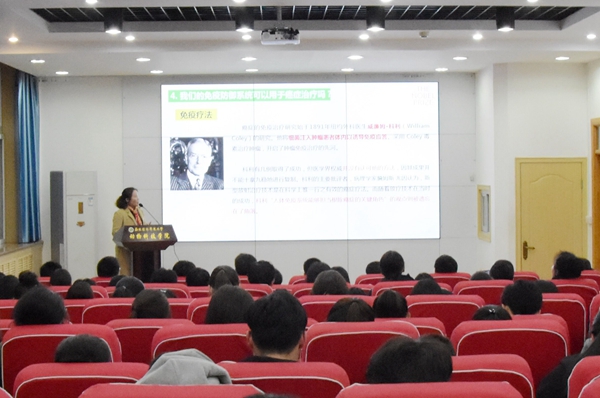 报告会伊始,潘传英副教授通过讲述诺贝尔的生平故事告诉同学们,科研精神是一种崇高的理想、一种为了追求真理而坚持不懈的精神,引发了现场同学的共鸣。随后,她以电影《我不是药神》中的慢性粒白血病为例,向同学们介绍了“靶向疗法+免疫疗法”这一治疗癌症的方法,反驳了癌症是绝症的说法。她表示:“细胞癌变引发恶性肿瘤,进一步恶化导致癌症,造成我国每年近300万人死亡。今年诺贝尔奖获得者詹姆斯•艾利森和本庶佑的研究成果展示了抑制免疫系统‘刹车片’的不同机制是如何应用于癌症治疗的,在理论上为癌症治愈提供了可能,是我们抗击癌症征程中的一个里程碑。”