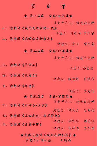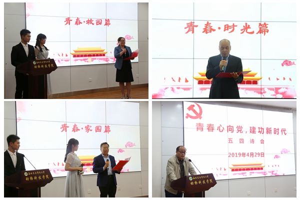 在诗会的第三部分--青春•家国篇中,开启人赵运良副院长指出,青春的底色是奋斗,他希望青年朋友们要有大志向、大格局、大学识、大爱心,用行动书写人生的美好篇章。百年前,家国情怀支撑着彼时的青年人勇立潮头,于民族危亡时挺身而出。作为对五四运动100周年献礼,同学们的诵读铿锵有力,震撼人心。一首《沁园春·长沙》刻画了恰同学少年之风华正茂;一首《五四之火,永不停息》致敬沧桑百年的峥嵘岁月;最终,一首《青春中国》完美收官,淋漓尽致地展现青年学子氤氲于胸的壮志豪情。
