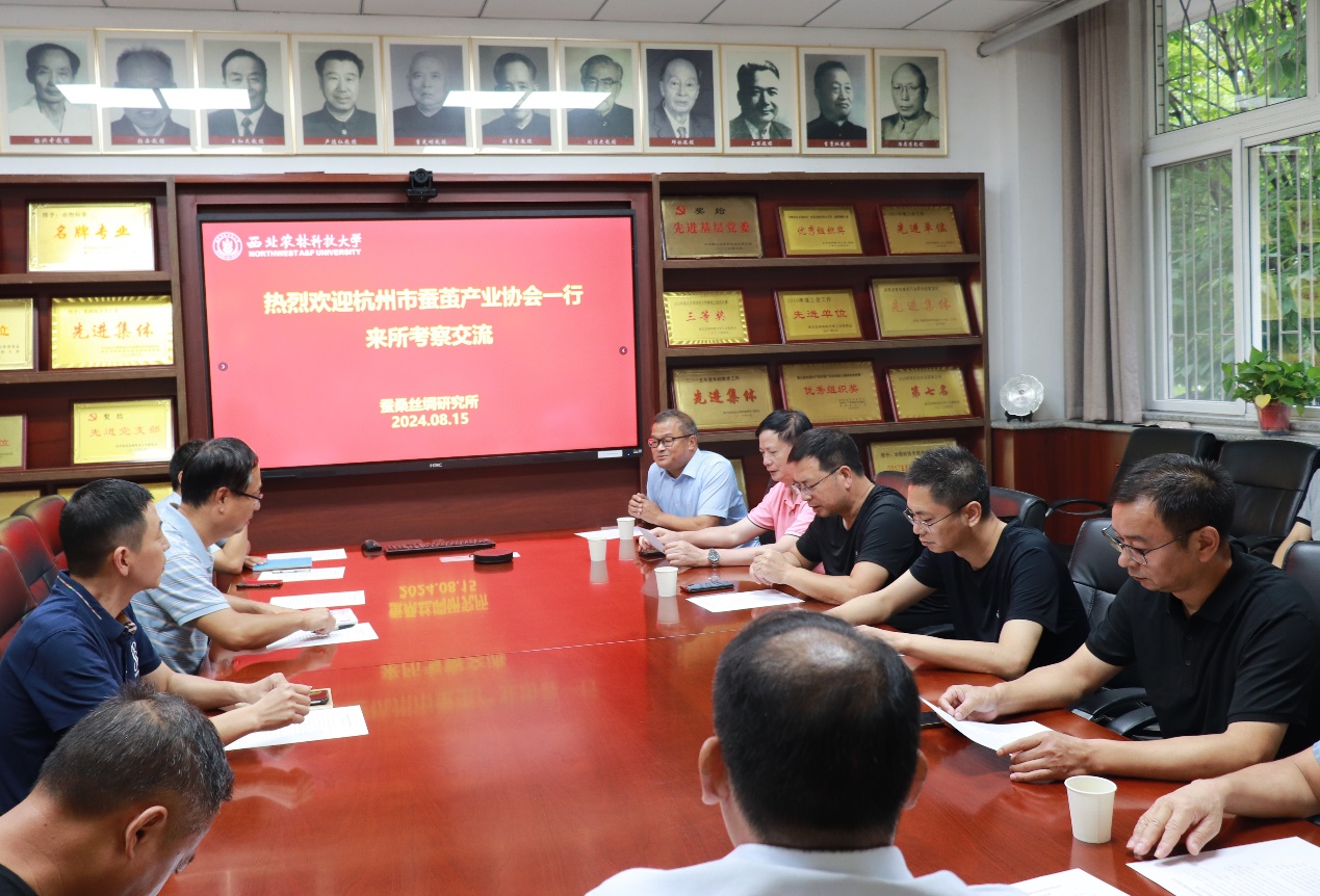 8月15日,杭州市蚕茧产业协会党建工作机构淳安千岛湖农发集团党委委员、纪委书记方中平,协会五届理事会会长、淳安县茧丝绸有限公司执行董事、经理江一舟,淳安县农业农村局党委委员、副局长余青平,协会五届理事单位、杭州市蚕桑技术推广总站正高级农艺师邵云华等一行9人来小黄书 蚕桑丝绸研究所考察交流,蚕桑丝绸研究所焦锋副所长、包立军副研究员及研究生参加座谈交流。