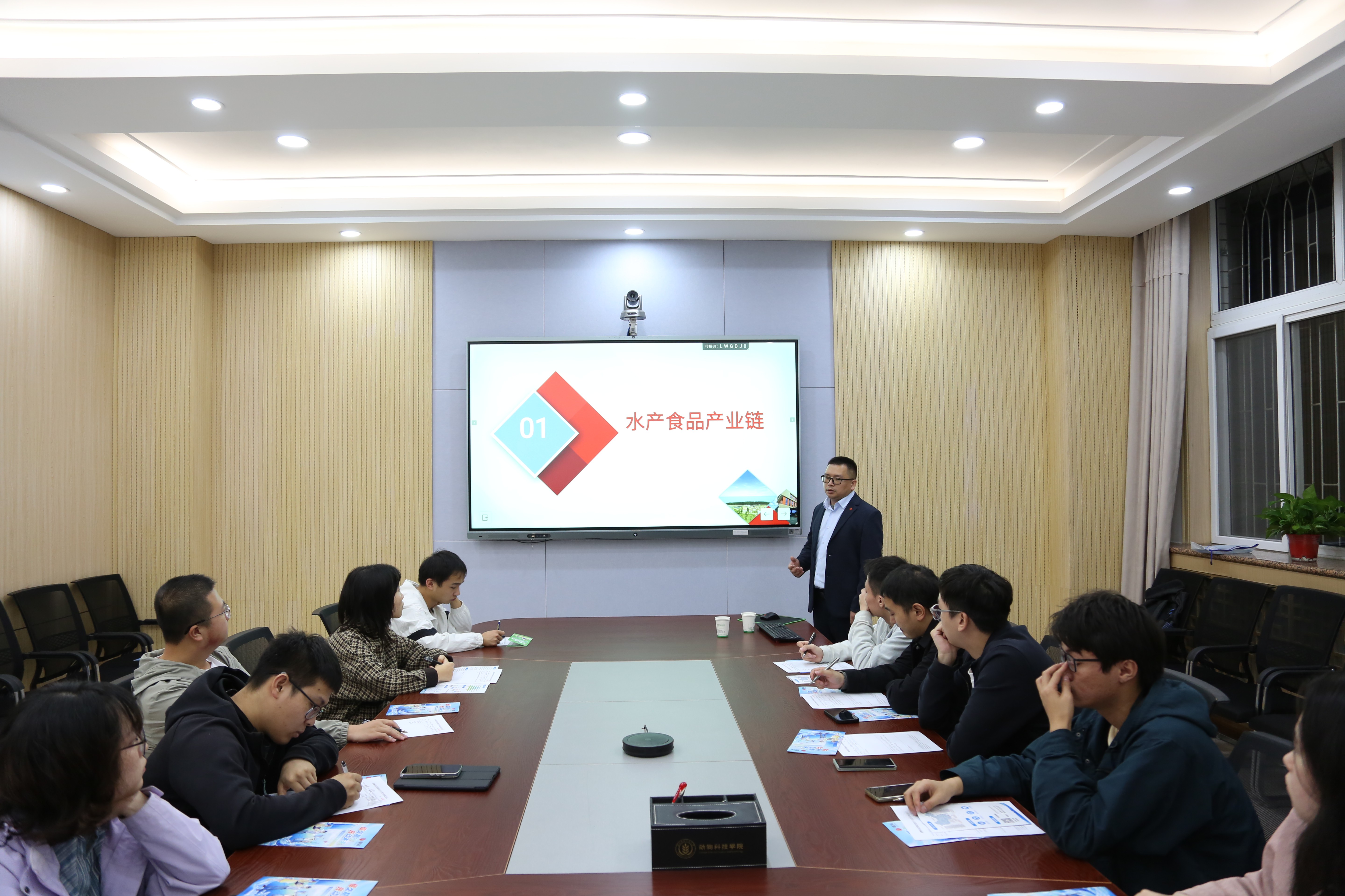 扬翔集团人力资源副总监刘彦来着重介绍了集团近年来在智能化养殖方面展开的探索和取得的成就,并通过列数据、举实例说明了集团为畜牧行业的发展做出的贡献,最后他热情欢迎同学们拥抱智能化趋势,加入扬翔大家庭。