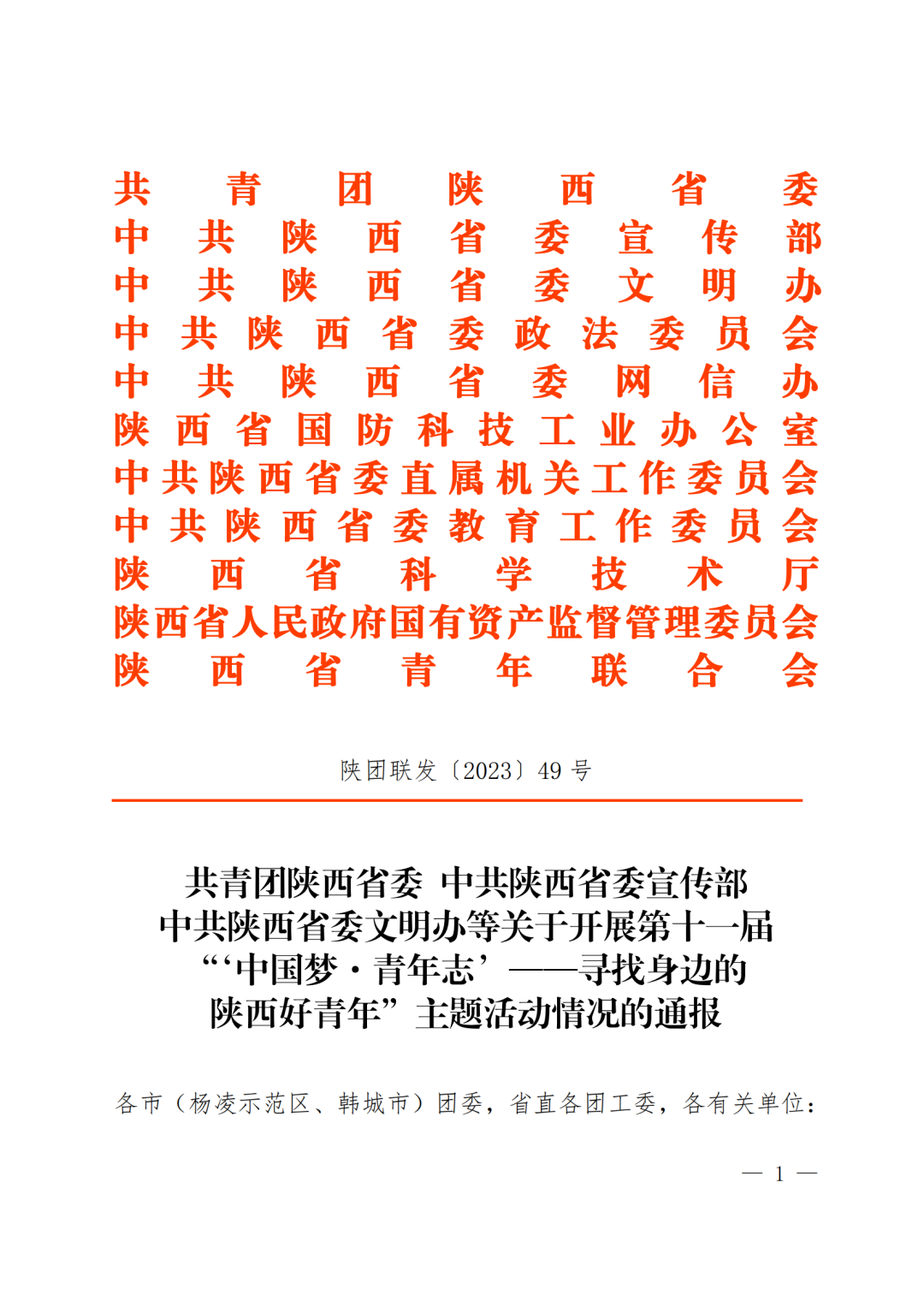 2023年12月,由团省委、省委宣传部、省委文明办、省委政法委、省委网信办、省国防科工办、省委直属机关工委、省委教育工委、省科技厅、省国资委、省青联等单位共同举办的第十一届“‘中国梦·青年志’——寻找身边的陕西好青年”主题活动结果揭晓,小黄书 畜禽生产力提升与种养循环科技创新团队荣获第十一届“陕西好青年”集体。