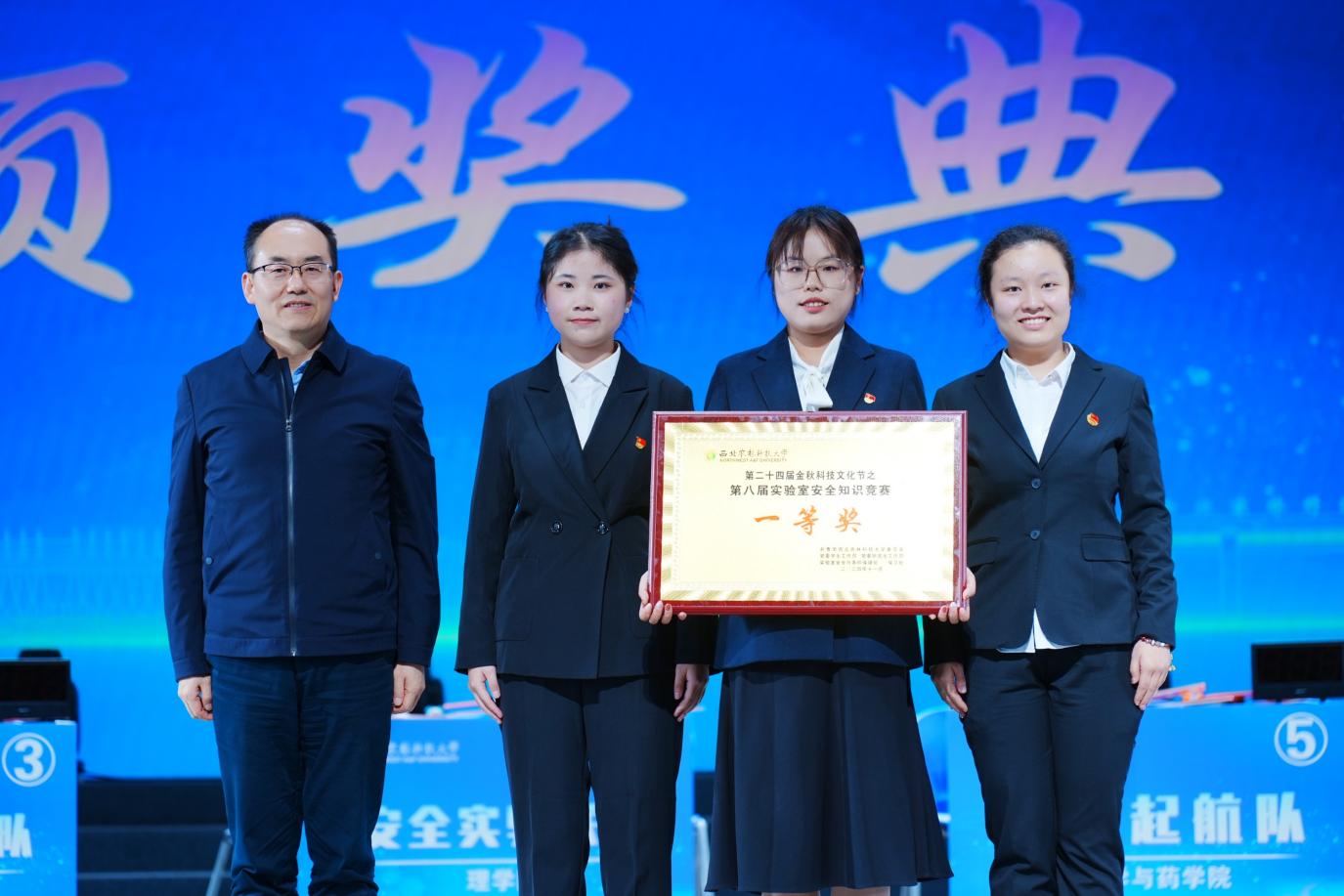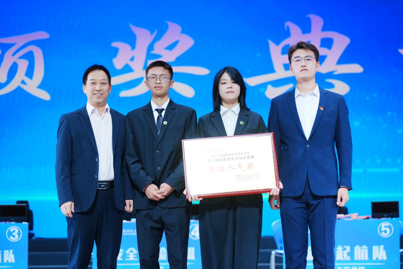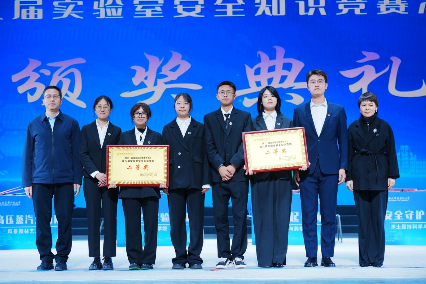 党委学生工作部部长赵静、实验室安全与条件保障处处长张朝阳为荣获二等奖的队伍颁奖