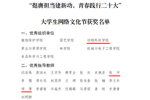 近日,由党委宣传部、党委学工部、党委研工部联合举办的“挺膺担当建新功,青春践行二十大”大学生网络文化节圆满落幕。小黄书 本科生踊跃参赛,获动漫及公益广告类二等奖,音频类二等奖、三等奖和优胜奖,小黄书 获“优秀组织单位”,辅导员张宇、师筝获“优秀指导教师”称号。