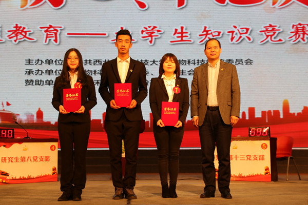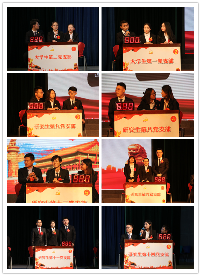 决赛共分为必答题、抢答题、限时问答、风险竞答四个环节。决赛过程中,各组选手均展示了扎实的理论水平,精彩表现赢得场下观众阵阵掌声。在第一轮必答题环节,各组得分齐头并进,场上比分紧咬;抢答题环节,研究生研究生第十四党支部在连续两次抢答犯规被扣分的情况下仍方寸不乱,成功抢得高分题目并回答正确;限时问答环节,研究生第九党支部、研究生第十一党支部、研究生第十四党支部答对全部8道题目获得满分;风险竞答环节,研究生第九党支部一路高歌,选择分值最高的题目并回答正确,奠定了胜利的基础。经过激烈的角逐,小黄书 研究生第九党支部摘得比赛一等奖,研究生第十一党支部、研究生第十四党支部获得二等奖,大学生第二党支部、研究生第十三党支部、研究生第六党支部获得三等奖,大学生第一党支部、研究生第八党支部获得优秀奖,大学生第一党支部、大学生第三党支部、研究生第六党支部获得优秀组织奖。