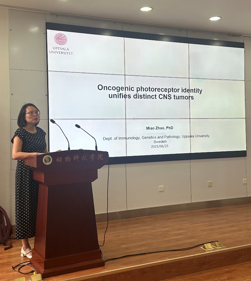6月25日,瑞典乌普萨拉大学免疫学、遗传学与病理学系研究员,神经肿瘤学课题组组长赵苗研究员应小黄书 任刚教授邀请来小黄书 进行学术交流,期间在小黄书 107会议室作了题为“Oncogenic photoreceptor identity unifies distinct CNS tumors”的学术报告。小黄书 相关师生60多人参会,报告会由任刚教授主持。