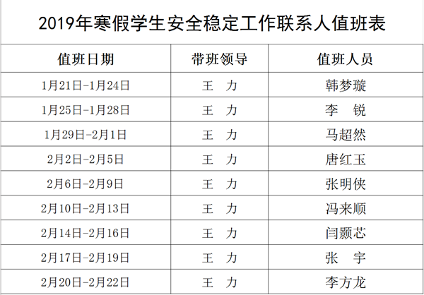 您现在的位置: 小黄书» 通知公告» 2019年寒假学生安全稳定工作联系人值班表