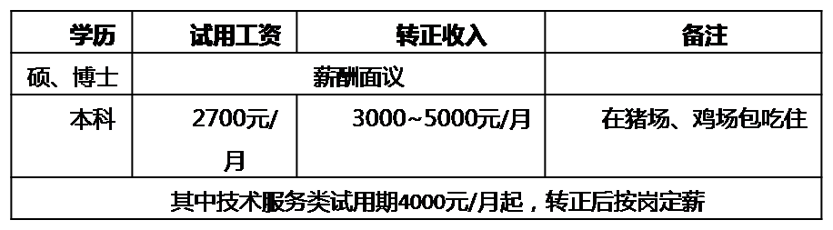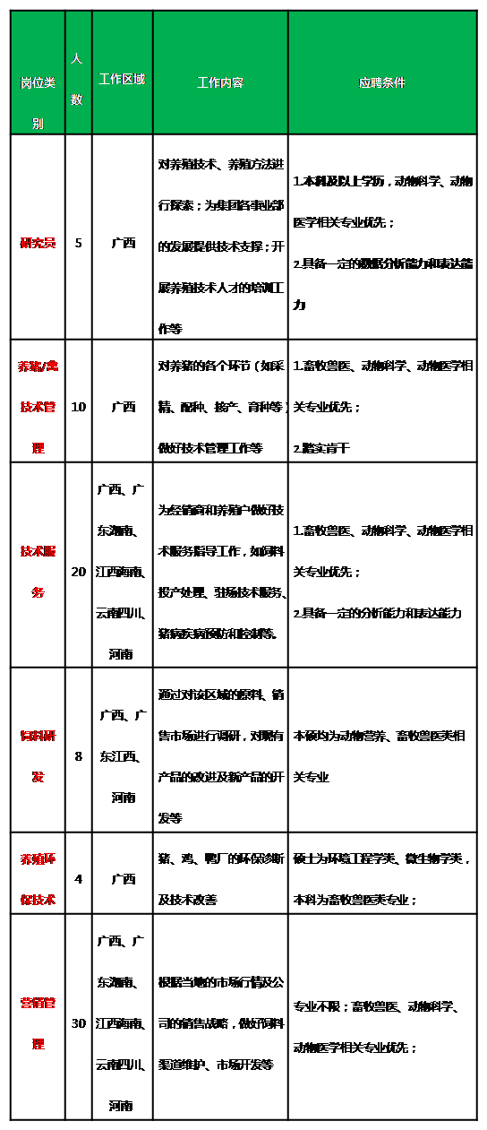应聘人员进入集团层面培养计划,培养方向为各事业部三到五年内的技术/管理人员。集团专门提炼出“新人培养 5 步法” “全员培养7步法”“新人八步成交法”等,开设禽料研修班、养猪大学课程学习,并提供极多的大型猪场实际管理机会及与行业先进技术交流的计划等。因此,需要人员有强烈的学习欲望和奋斗精神。