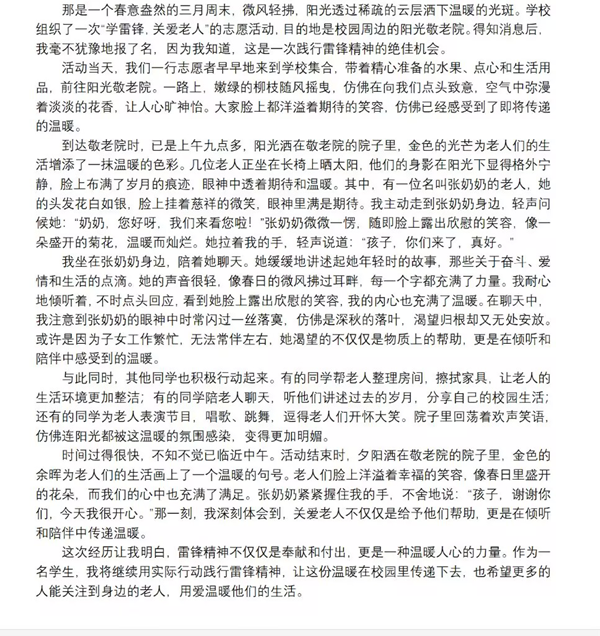 雷锋精神是青年学子成长路上的精神坐标。本次活动鼓励学生从日常生活的细微处入手,通过文字展现身边“雷锋式”人物的感人事迹,或记录参与志愿活动,助人为乐的亲身经历。无论是投身于志愿活动的辛勤身影,还是帮助他人时的慷慨笑颜,均能成为笔下鲜活的素材。活动负责人表示“希望通过征文,让同学们发现平凡中的伟大,激励更多人用行动传递温暖。