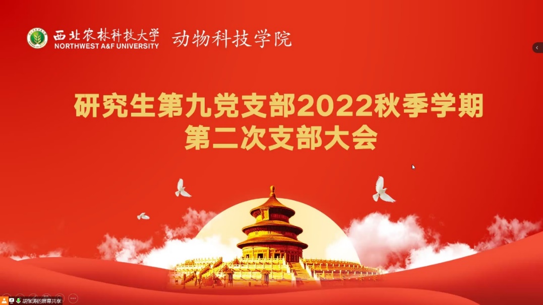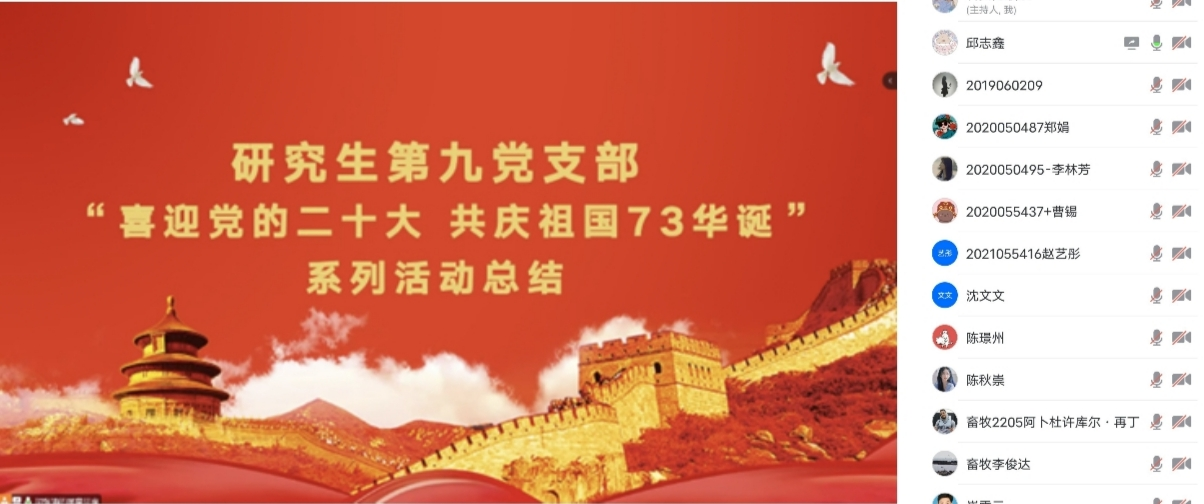为喜迎党的二十大,庆祝新中国成立73周年,10月6日,小黄书 研究生第九党支部召开以“喜迎党的二十大∙共庆祖国73华诞”为主题的秋季学期第二次支部大会,支部共计50余名成员参会,会议由支部书记胡张涛主持。