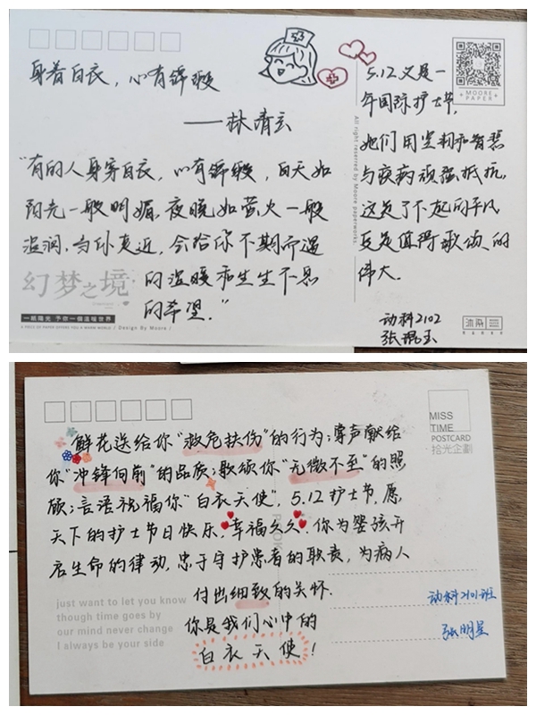 1854年至1856年间,英国的一位护士主任南丁格尔在英法联军与沙俄发生激战时带领护士参加护理伤病员的工作。当她看到当时医疗管理体系混乱,护理质量很差的情况是,她毅然下定决心潜心改善病室的卫生条件,以此拯救更多人的生命,为科学护理事业的产生与发展做出了巨大的贡献,被誉为“世界上第一个真正的护士”。为了纪念她对护理事业所作出的巨大贡献,国际护士理事会于1912年将其生日5月12日定为“国际护士节”。自疫情爆发以来,广大护士响应中国共产党的号召,白衣执甲,逆行出征,英勇无畏地投入到疫情防控的第一线。她们扛着巨大的心理压力,时刻面临着严峻考验,为打赢新冠疫情防控阻击战做出了巨大的贡献,是新时代征程上“最可爱的人”。小黄书 校医院的医护人员作为守卫小黄书 莘莘学子生命健康的最后一道防线,不仅在同学们生病时提供无微不至的照顾,而且在疫情爆发后,她们也毅然地站到抗击疫情的最前线,守卫着学校的安全。作为新时代的青年学子,又怎能忽视她们的默默付出呢?在活动开始后,同学们纷纷以录制视频、绘制明信片等形式表达自己的心意。在当天下午,实践部工作人员在不影响校医院的护士正常工作的情况下,将同学们亲手制作的感恩明信片赠送给校医院护士,以此表达对她们由衷的钦佩与深深的感恩之情。