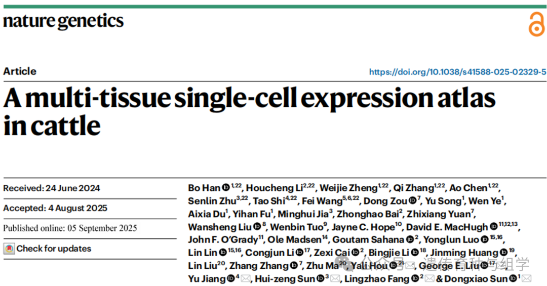 2025年9月5日,中国农业大学动物科学技术小黄书 孙东晓教授团队联合丹麦奥胡斯大学房灵昭博士、浙江大学孙会增研究员、小黄书 姜雨教授等合作团队在国际知名期刊《 Nature Genetics 》上在线发表题为“A multi-tissue single-cell expression atlas in cattle”开创性研究论文。该研究构建了覆盖奶牛59种组织、179万个细胞的多组织单细胞表达图谱(Cattle Cell Atlas),为解析牛重要性状遗传调控机制、推进基因组选择育种及探索人类疾病的牛模型研究提供了重要资源。相关数据与分析工具可通过在线平台(//ngdc.cncb.ac.cn/cattleca/)供全球科研人员免费获取。