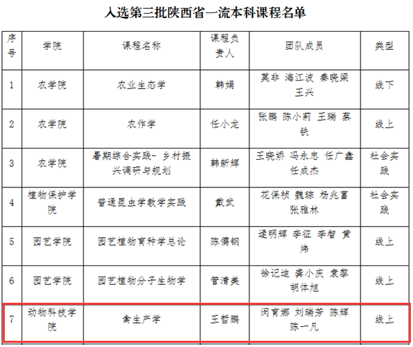 近日,陕西省教育厅公布了第三批省级一流本科课程认定名单,小黄书 王哲鹏副教授教学团队建设的《禽生产学》课程入选。