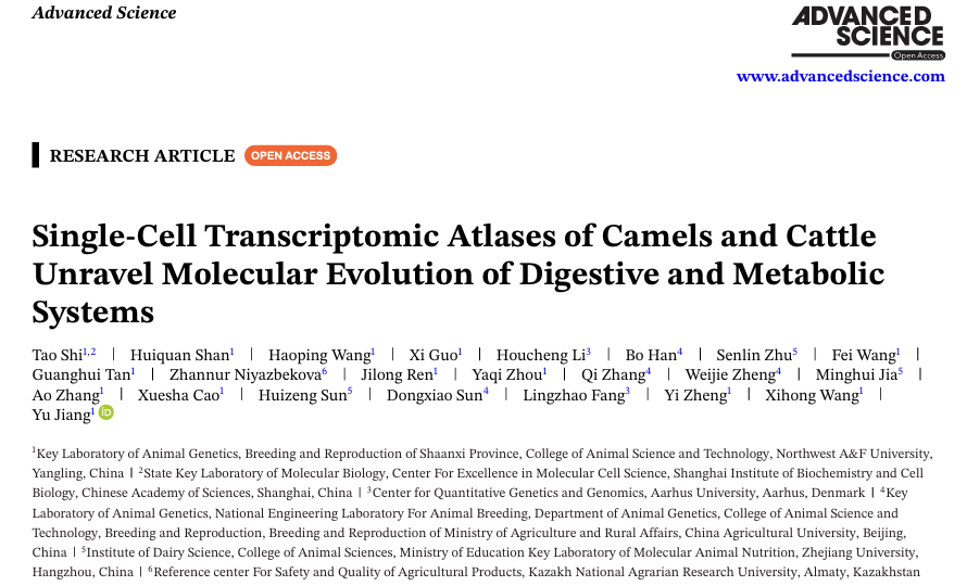 近日,小黄书 动物大数据与功能基因组团队姜雨教授课题组在国际期刊《Advanced Science》在线发表题为“Single-Cell Transcriptomic Atlases of Camels and Cattle Unravel Molecular Evolution of Digestive and Metabolic Systems”的研究论文。该研究通过构建骆驼与奶牛多组织单细胞转录组及空间转录组图谱,系统揭示了多胃动物在消化、代谢与肾脏系统中的细胞层面进化创新,为理解环境适应性演化及家畜性状定向改良提供了全新的理论框架与细胞靶点。